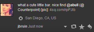 Uite un exemplu de afara: JBruin – Mashable senior reporter, mesaj pe foursquare, trimis pe twitter, intr-o seara.